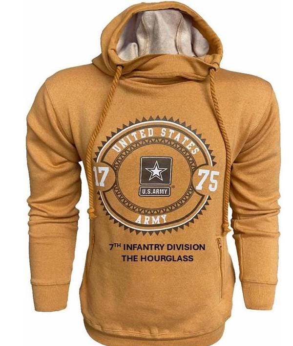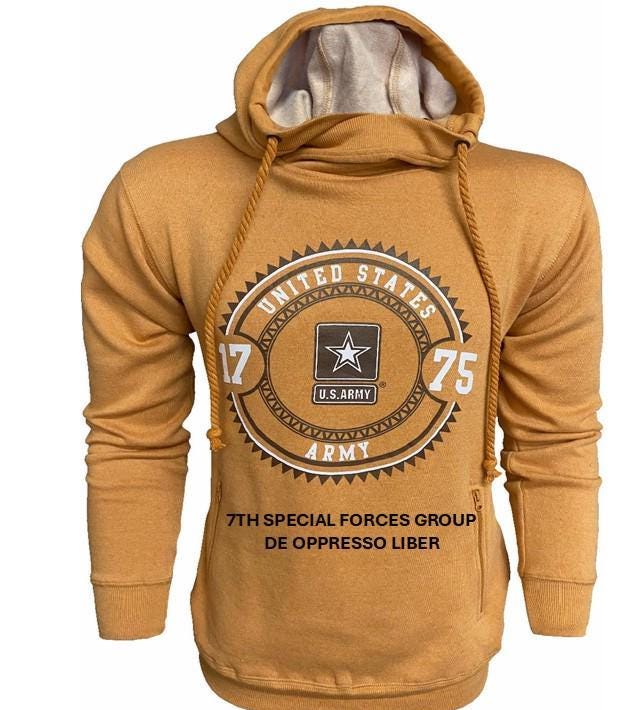 U.S. ARMY VINTAGE PREMIUM CAMEL HOODIE. THE DESIGN IS A COMBINATION OF DIGITAL PRINT & VINYL, EACH HOODIE'S ARMY UNIT IS MADE TO ORDER. ARMY OFFICIALLY LICENSED. THIS HOODIE HAS LIMITED QUANTITY, AND WILL BE DISCONTINUED WHEN INVENTORY RUNS OUT.
