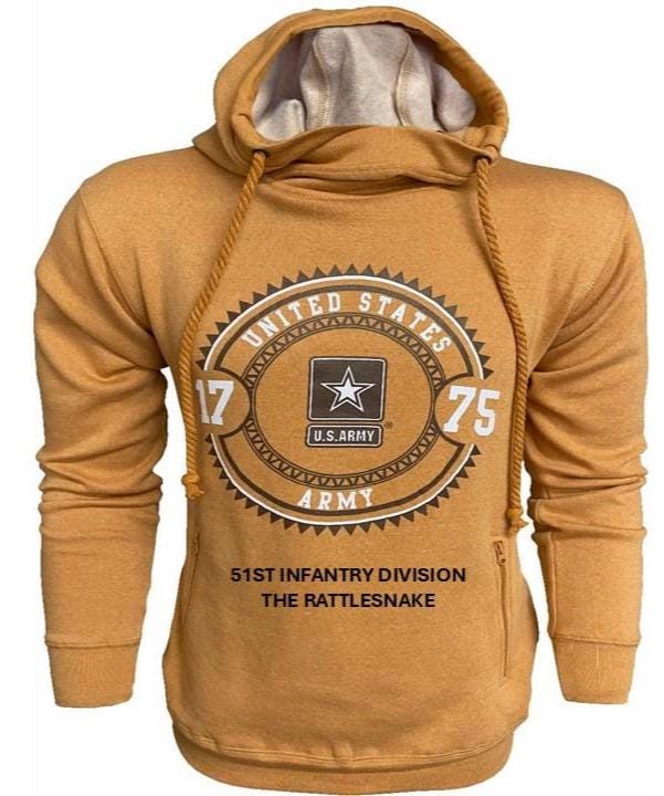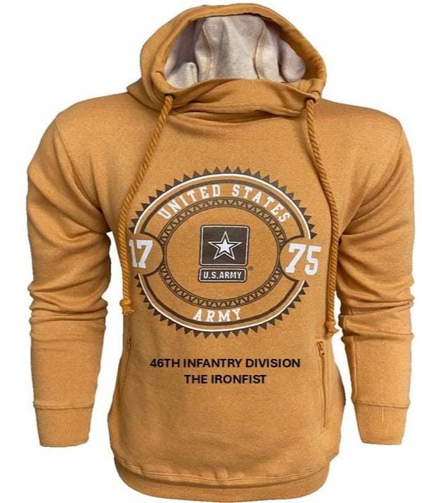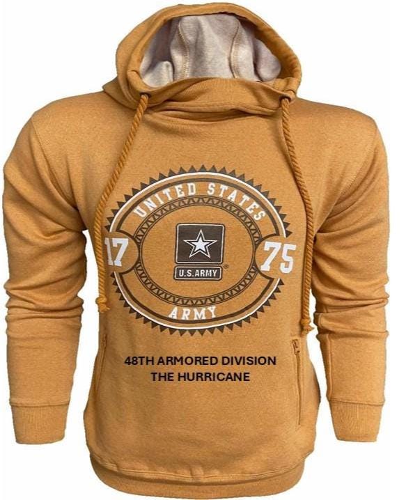 U.S. ARMY VINTAGE PREMIUM CAMEL HOODIE. THE DESIGN IS A COMBINATION OF DIGITAL PRINT & VINYL, EACH HOODIE'S ARMY UNIT IS MADE TO ORDER. ARMY OFFICIALLY LICENSED. THIS HOODIE HAS LIMITED QUANTITY, AND WILL BE DISCONTINUED WHEN INVENTORY RUNS OUT.