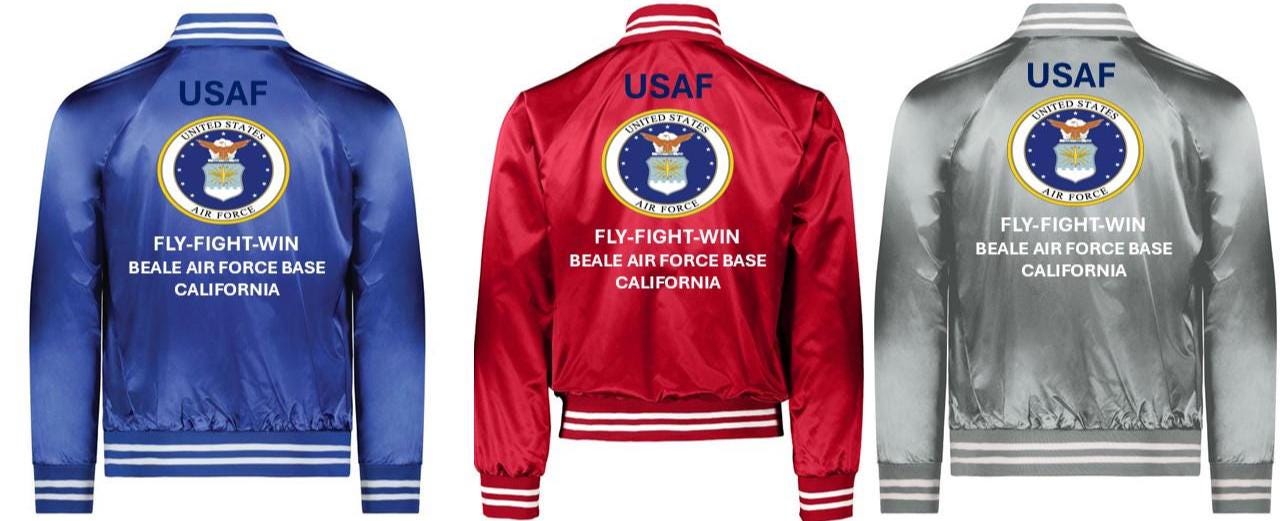 Beale Air Force Base* California* Fly-Fight-Win * AIR FORCE Vinyl Design Satin Jacket (Back Only) USAF Officially Licensed